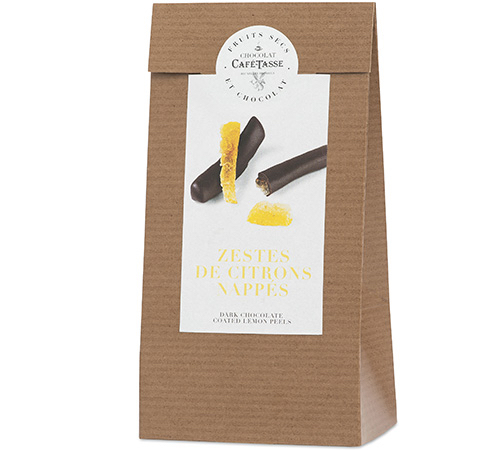 Ce sachet se compose de 125 grammes de zestes de citron nappés de chocolat noir signés Café-Tasse.
