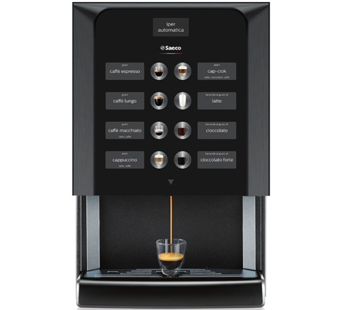 L'IperAutomatica de Saeco est à mi-chemin entre la machine à café et le distributeur automatique. Elle est idéale pour tous les lieux en libre-service (salle de pause, cafétéria, hôtel...) avec une consommation jusqu'à 50 cafés par jour.