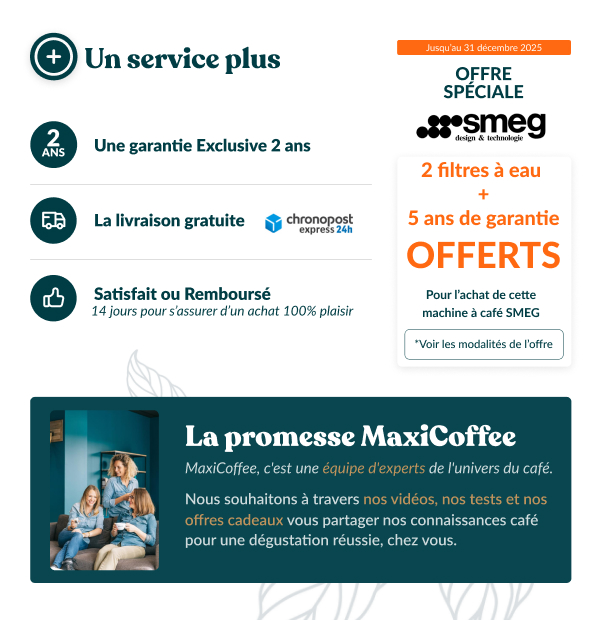 Dans l’esprit Smeg, cette machine associe design élégant, simplicité d’usage et robustesse. Son interface intuitive à LED facilite la prise en main, tandis que son format compact s’intègre même dans les petites cuisines. L’extraction met en valeur les arômes, avec deux niveaux d’intensité. Facile à entretenir grâce à la cartouche filtrante, au détartrant et au nettoyant lait, elle offre fiabilité et longévité. Idéale pour un couple ou de petits consommateurs, elle séduit par sa performance et sa polyvalence.