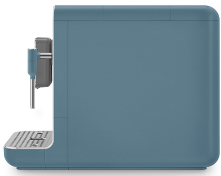Cette cafetière Smeg avec broyeur intégré bénéficie d’un gabarit ultra compact, avec seulement 180 mm de largeur, ce qui permet de l’installer même dans les espaces restreints. Dimensions : hauteur 336 mm, largeur 180 mm, profondeur 433 mm. Les buses d’écoulement sont ajustables en hauteur pour accueillir divers formats de tasses et le bac de récupération en aluminium est amovible. Hauteur minimale : 90 mm – Hauteur maximale : 185 mm. Le design moderne marie une carrosserie en ABS bleu mat, un cadre en aluminium satiné et une façade en aluminium brossé élégante. Des LED illuminent les tasses pendant l’extraction. Capacités idéales pour un couple ou de petits consommateurs :
