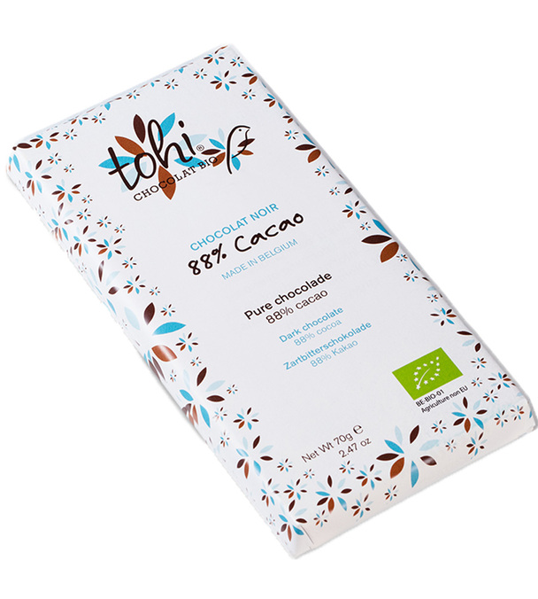 Dégustez cette tablette de chocolat noir 88% cacao du chocolatier belge Tohi. Ingrédients issus de l'Agriculture Biologique. Conditionnement : 70 grammes.