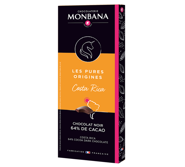 Voyagez avec cette tablette de chocolat noir 64% de cacao en provenance du Costa Rica. Monbana fait le tour du monde avec cette tablette de chocolat noir intense de 100g. Ce chocolat offre en bouche des notes de miel légèrement caramélisées, typiques du cacao du Costa Rica. À essayer de toute urgence !