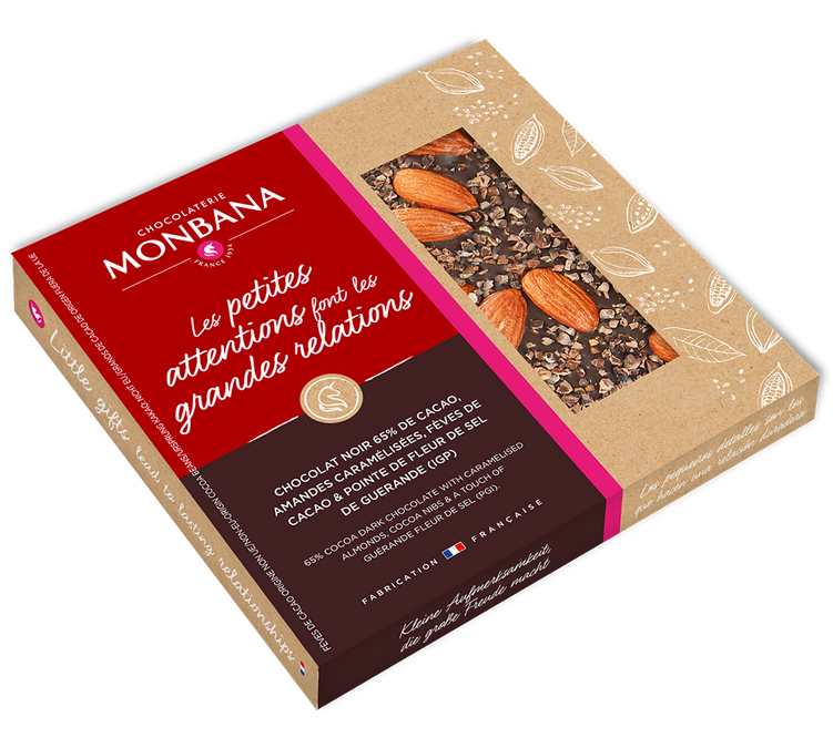 Découvrez la tablette de Monbana intitulée "Les petites attentions font les grandes relations" ! Cette tablette de chocolat noir à 65 % de cacao, de 85 g, est délicieuse à souhait. Ce chocolat croque sous la dent avant de fondre sur la langue... Ses amandes caramélisées et cristaux de sel de Guérande ajoutent une saveur exquise qui donne le sourire à tous les gourmands.