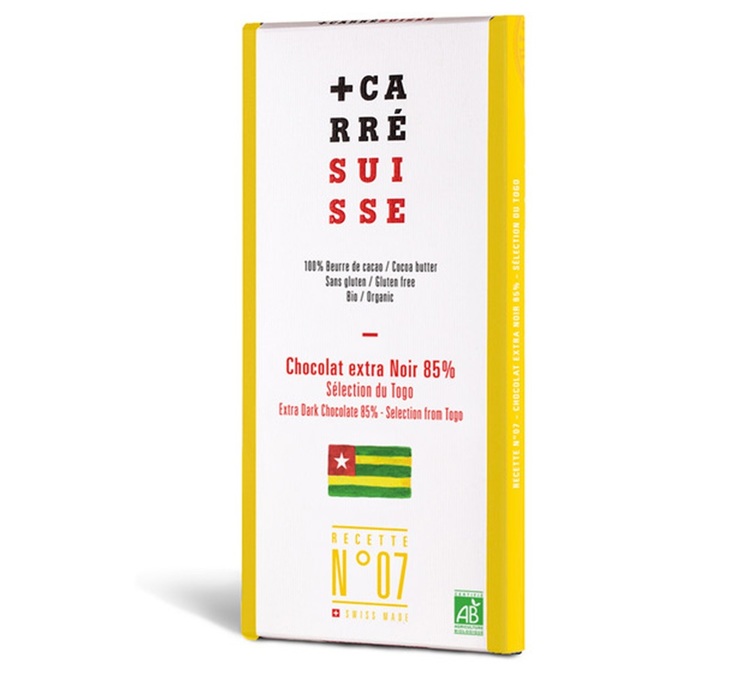 Delicious extra dark chocolate bar with 85% special selection Togo Grand Cru cocoa from Carré Suisse. Certified organic. Contents 100g. 100% cocoa butter, gluten free.