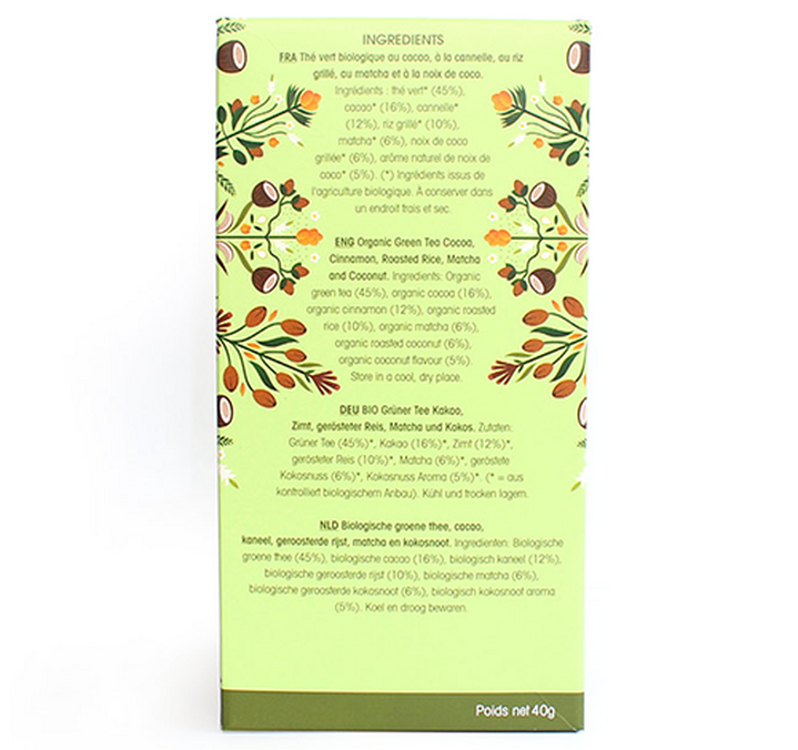 Thé vert* (45%), cacao* (16%), cannelle* (12%), riz grillé* (10%), matcha* (6%), noix de coco grillée* (6%), arôme naturel de noix de coco* (5%). *Ingrédients issus de l'agriculture biologique.