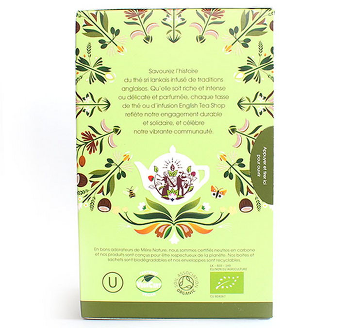 English Tea Shop, c'est une marque qui depuis 10 ans révolutionne le monde du thé en proposant des thés et infusions dont les ingrédients sont issus de l'Agriculture Biologique du Sri Lanka. Du champs à la tasse, la marque se veut écoresponsable afin que tous les acteurs du thé aient un même plaisir à le travailler et le déguster. C'est là leur philosophie, qu'on nomme Prajãva en sri lankais.
