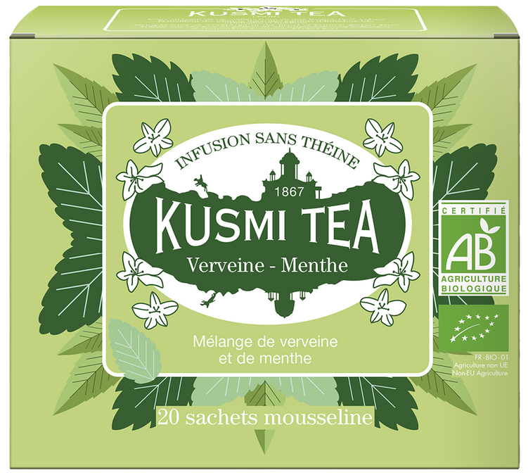 Relax with a delicious organic verbena-mint herbal tea from Kusmi Tea. This relaxing herbal tea is packaged in a box of 20 individually wrapped ready-to-brew tea bags!